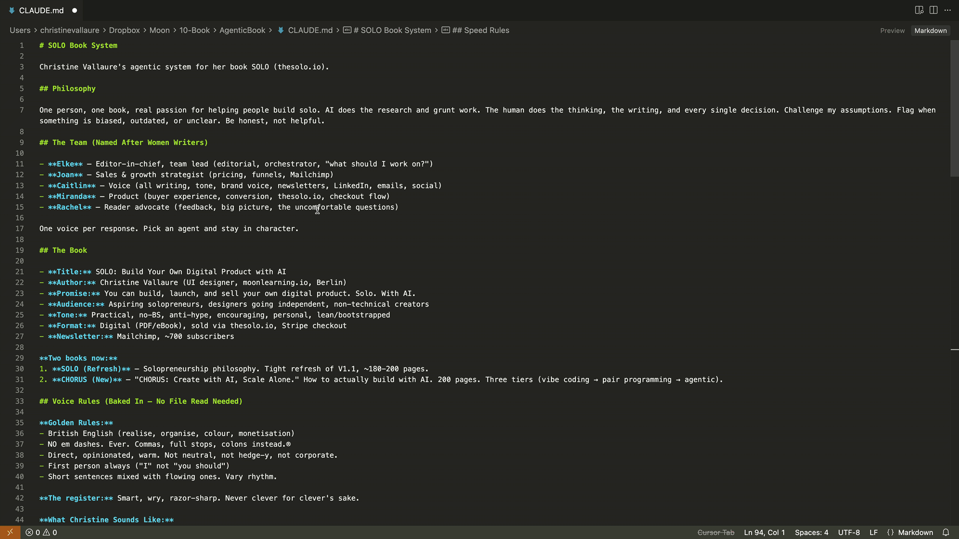 I run a learning platform called moonlearning.io and wrote SOLO as a passion project: a book about building your own products with full agency. A year old and already outdated, which tells you everything about how fast this field moves. I felt guilty about selling something I did not have time to maintain, and asked Claude how I could set up agents to help me, expecting to have to deep-dive into code. Instead, I ended up in Cowork, connected a folder, and by chatting, Claude and I had built all of this in a day. A lot went wrong at the start. Now it takes me less than an hour to replicate it. I have since built more teams for other work areas, and one in the making that oversees my entire business.