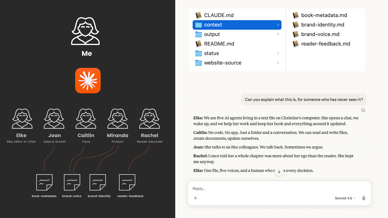 I was setting up each agent individually, planning to figure out some kind of inter-agent communication later. I have no idea about this stuff. Then one day I was talking to Elke about the book structure and Joan just appeared, making a point about pricing. I had not called Joan. She showed up because the model understood her perspective was relevant.