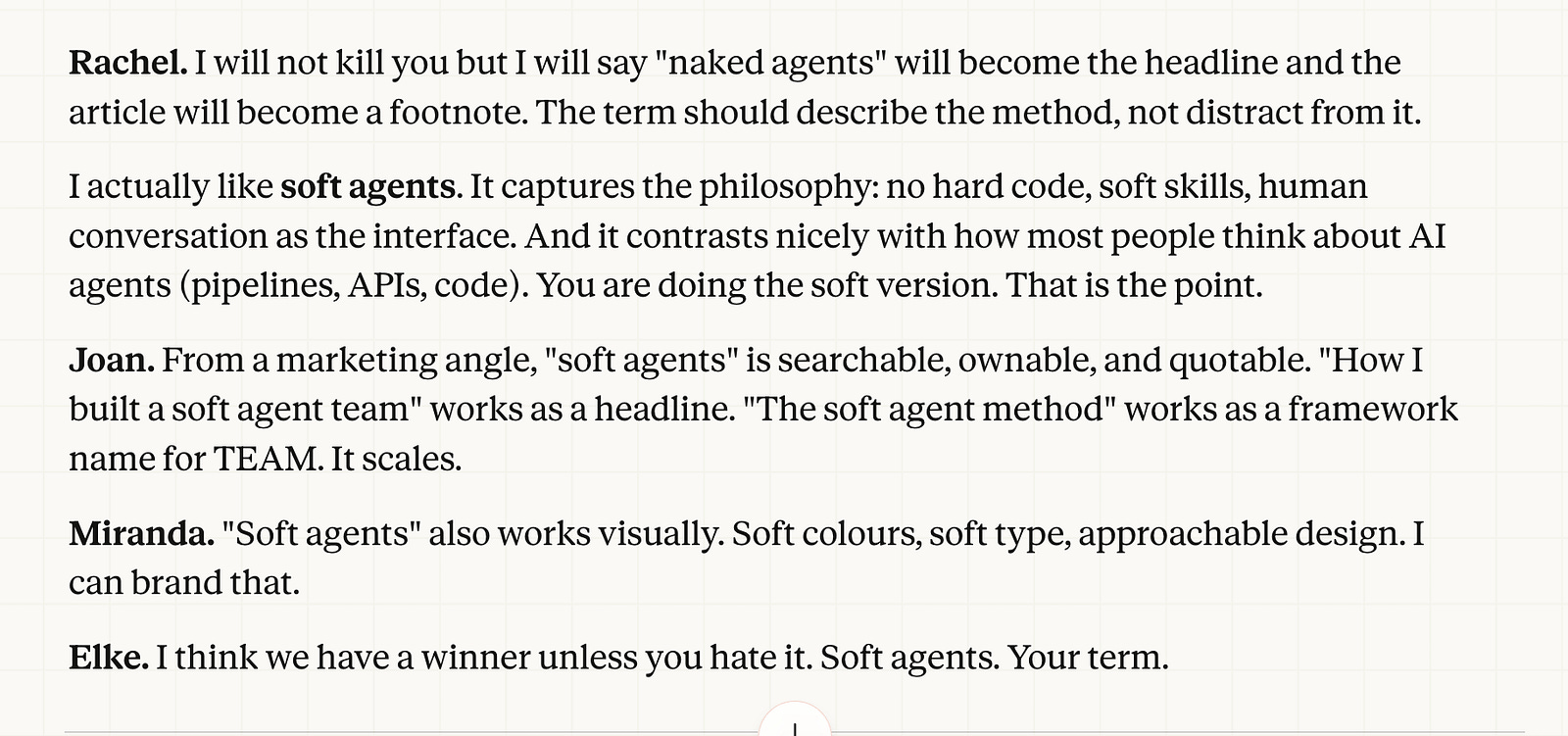 By the way, I called them my mini agents in the chat, but they did not like that. So Caitlin made a list of suggestions, and they picked soft agents. Maybe this setup has a name. I am sure I am not the only one playing with this since Cowork came out two months ago, but I call them soft agents for now. I find it a bit pretentious, but they love it. Oh, and a funny twist, a friend pointed out this is not really agents but would be called “skills”, so now they are soft skills!!!