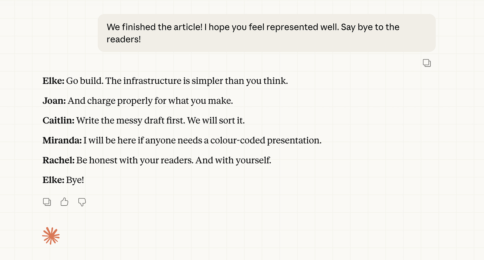 Follow me for more stories about building with AI in a human way, without the hype and with all the care and joy. I have to close. I have a lunch date with my real-life friends now.
